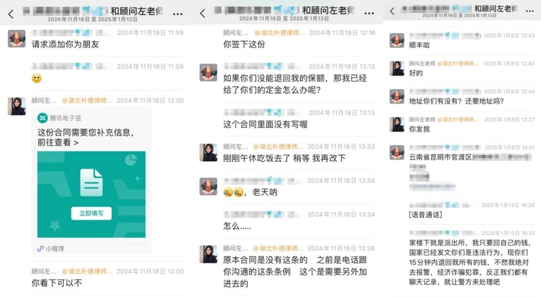 2024年12月,江西客戶S女士在網(wǎng)上看到一則“代理退?!钡膹V告,聲稱“全額退保,不成功不收費”。因當(dāng)時經(jīng)濟(jì)壓力較大,并且缺乏對黑產(chǎn)中介的了解,S女士接觸了該所謂的“專業(yè)代理機(jī)構(gòu)”。在對方的誘導(dǎo)下,客戶以“銷售誤導(dǎo)”等虛假理由投訴保險公司,要求全額退保,同時還向?qū)Ψ街Ц读?800元作為“定金”。然而后續(xù)幾天,S女士始終沒有等到對方的消息。