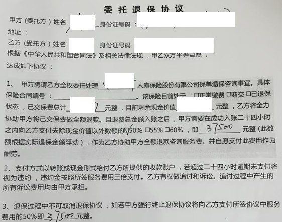 起初,李先生與所謂的“某律師”簽訂了一份委托退保協(xié)議,并聽從對方的要求編造虛假理由多方投訴保司。太平人壽工作人員多次邀約客戶面談但均被回絕,為取得客戶的信任,公司申請當(dāng)?shù)氐娜嗣裾{(diào)解委員會出面調(diào)解。在調(diào)解過程中,公司工作人員指出了該委托退保協(xié)議中存在的明顯漏洞——無論退保成功與否客戶都需向?qū)Ψ嚼U納一筆近4萬元的手續(xù)費。隨后當(dāng)客戶撥通電話質(zhì)問這位“律師”時,對方果然原形畢露,并威脅將依據(jù)該協(xié)議內(nèi)容上門追討。最終,客戶選擇報警處理,同時感謝太平人壽和調(diào)解員的耐心勸導(dǎo),并辦理了保單復(fù)效手續(xù)。