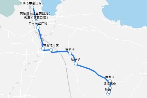 橋頭、橋頭稅務(wù)、威海三中、孟家莊、后亭子、溫泉湯、黃金頂小區(qū)、江家寨、豐禾商業(yè)廣場(chǎng)、蒿泊、韓樂坊、長峰,共12站。