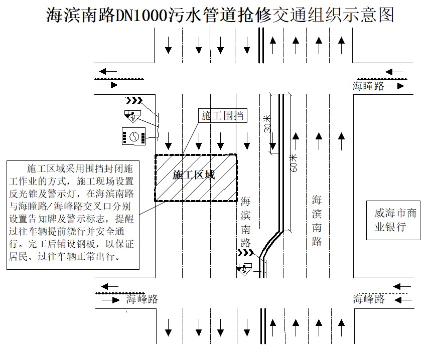 二、占用道路:施工期間封閉占用海濱南路與海瞳路紅綠燈向南40米處西半幅非機(jī)動車道及三條機(jī)動車道,海濱南路西半幅保留兩條機(jī)動車道通行,海濱南路東半幅保留三條機(jī)動車道通行,請過往行人、車輛減速慢行,注意安全。因施工給您帶來不便,敬請諒解。