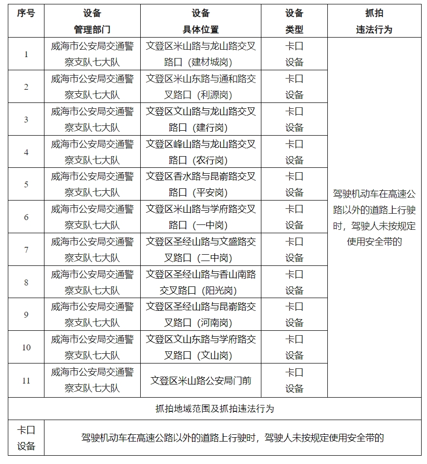 為保證道路交通安全,預(yù)防和減少交通事故的發(fā)生,根據(jù)《中華人民共和國道路交通安全法》及其實施條例等法律法規(guī)和相關(guān)技術(shù)規(guī)范的規(guī)定,依據(jù)《公安機關(guān)執(zhí)法公開規(guī)定》,現(xiàn)將文登區(qū)啟用的11處共11個交通技術(shù)監(jiān)控設(shè)備予以公示,自4月9日起,將對有關(guān)交通違法行為進行依法管理,請廣大交通參與者自覺遵守道路交通法律法規(guī),共同維護良好的道路交通環(huán)境。