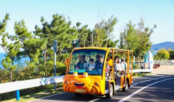 卡通觀光游覽車共10輛,有貓咪和螃蟹兩種卡通造型,主要在環(huán)海路1號輔線和2號輔線內(nèi)各個觀景平臺之間運行,招手即停。