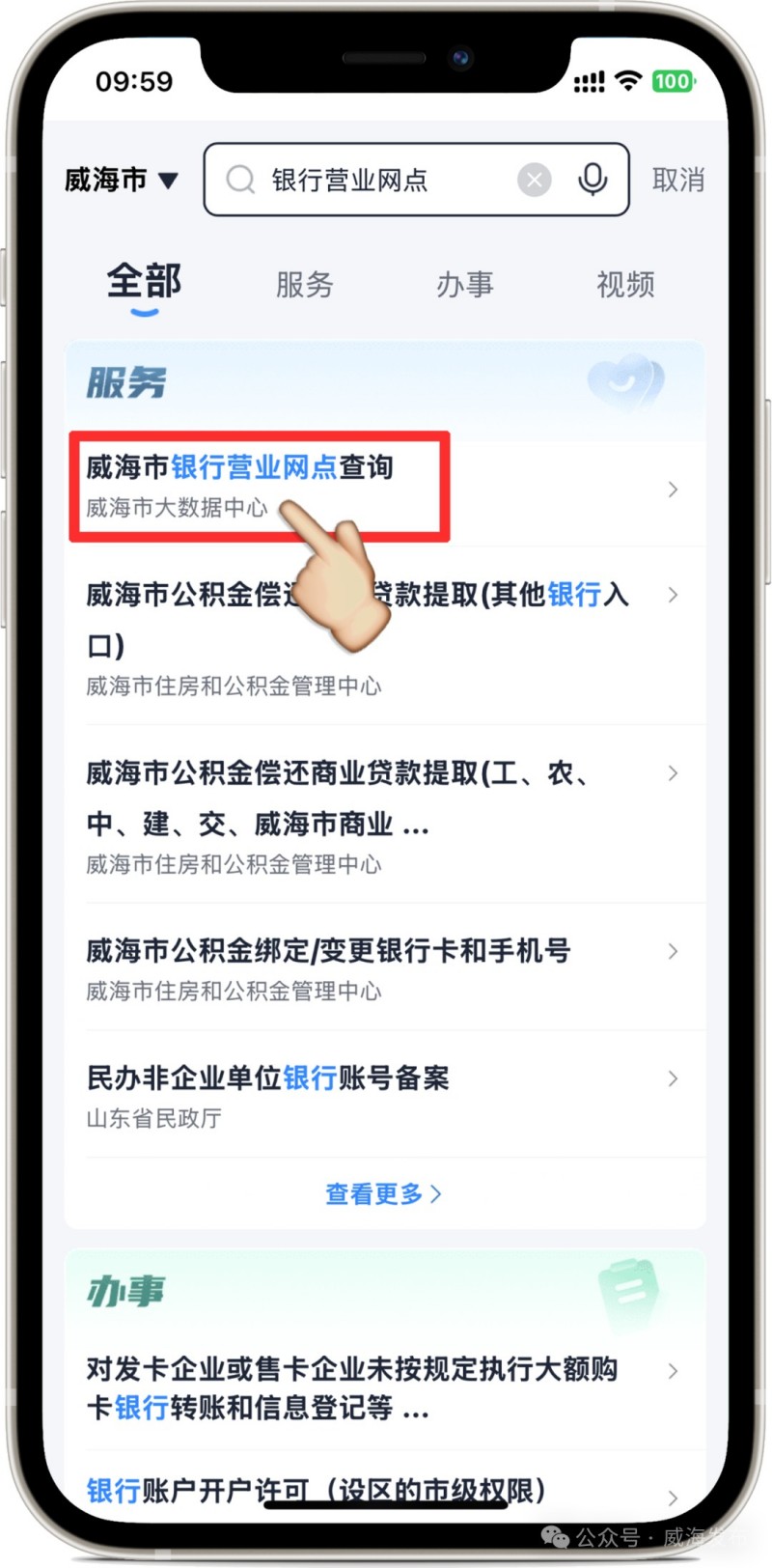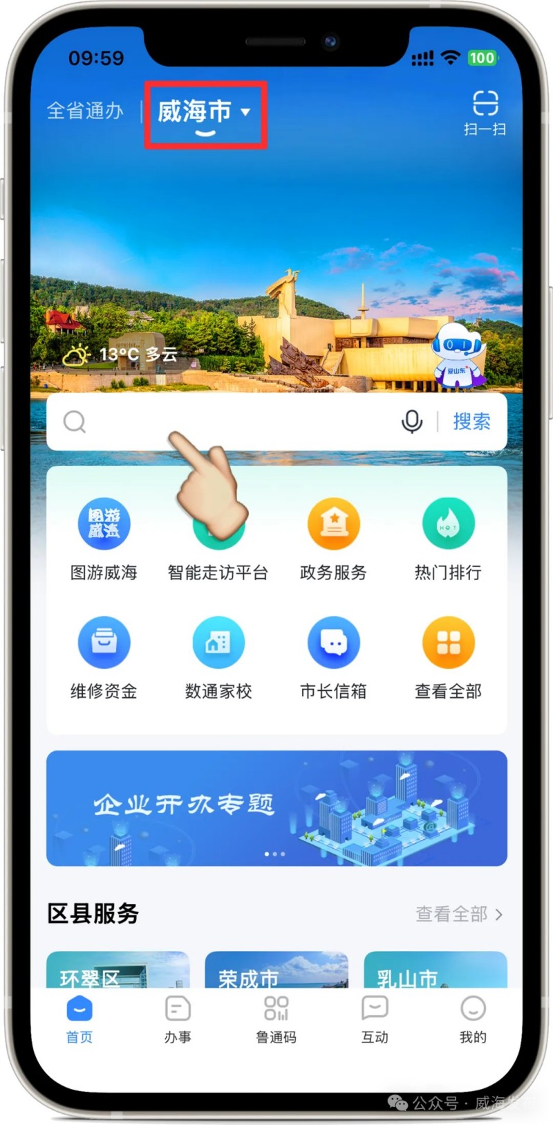 進(jìn)入“愛山東”APP后,在首頁左上角選擇進(jìn)入“威海市”,在搜索框搜索關(guān)鍵詞“銀行營業(yè)網(wǎng)點”,點擊進(jìn)入應(yīng)用。
