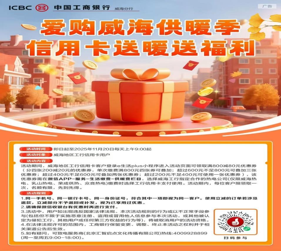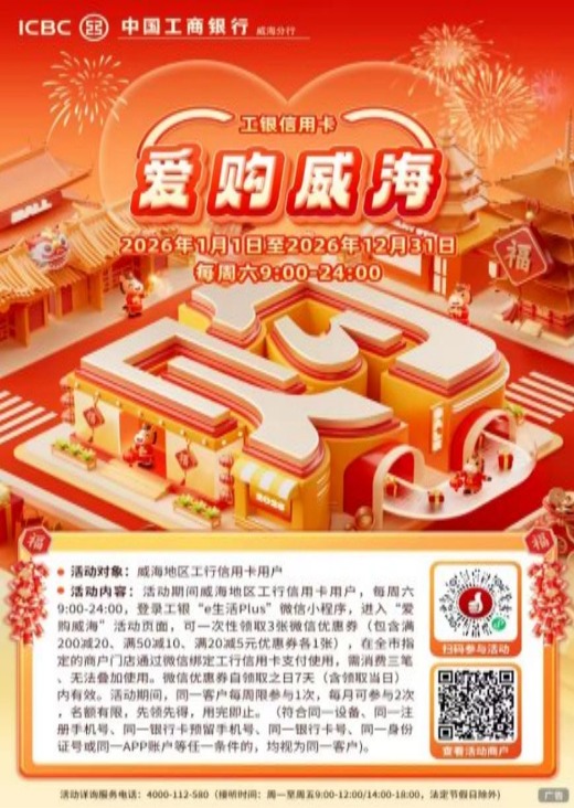 春潮涌動處,民生答卷新。近年來,站在激發(fā)消費(fèi)活力賽道上,中國工商銀行威海分行始終堅守“金融為民”初心,立足威海本地民生需求,將普惠金融服務(wù)與地方經(jīng)濟(jì)發(fā)展深度融合。精準(zhǔn)發(fā)力供暖繳費(fèi)、家電更新、商超餐飲等核心消費(fèi)場景,推出系列重磅優(yōu)惠活動,以“真金白銀”點(diǎn)燃市民消費(fèi)熱情,以大行擔(dān)當(dāng)書寫著服務(wù)威海高質(zhì)量發(fā)展的生動答卷。