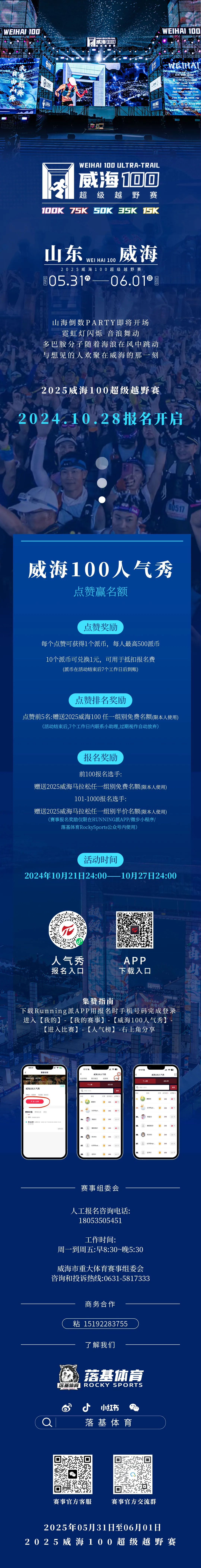 2025威海100超級越野賽由威海市重大體育賽事組委會主辦,威海市體育局、威海市體育總會承辦,煙臺落基體育有限公司具體負責賽事運營。賽事設100KM、75KM、50KM、30KM、15KM共5個競賽距離,將接受不超過3000人報名參賽。